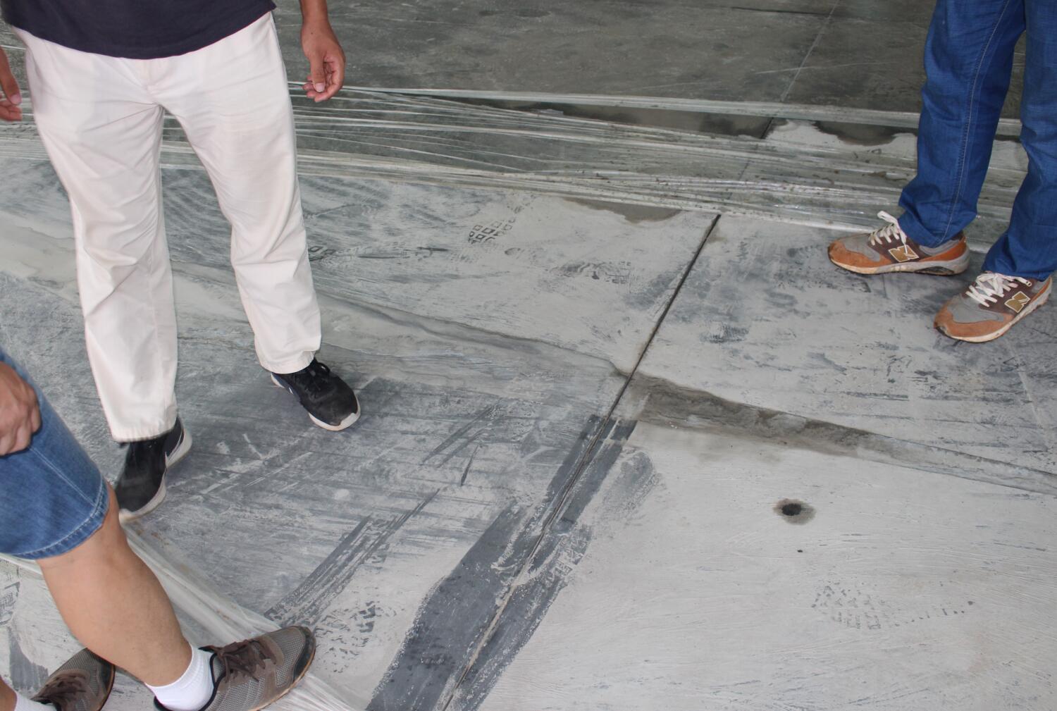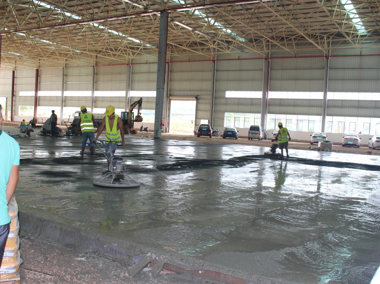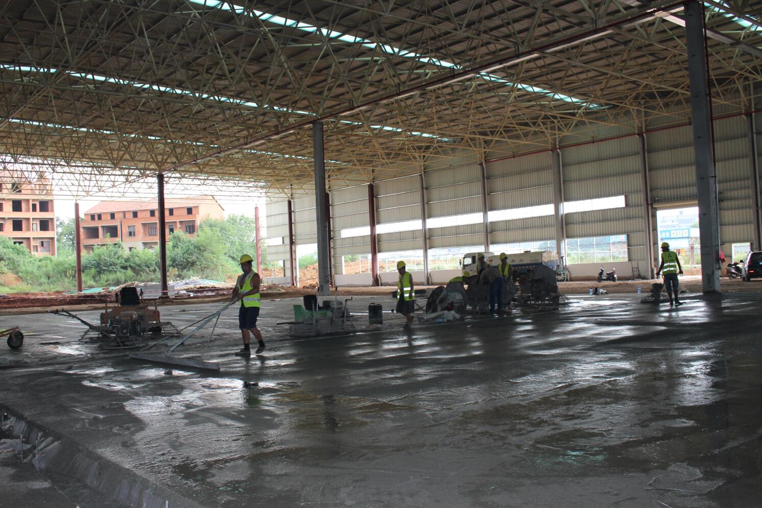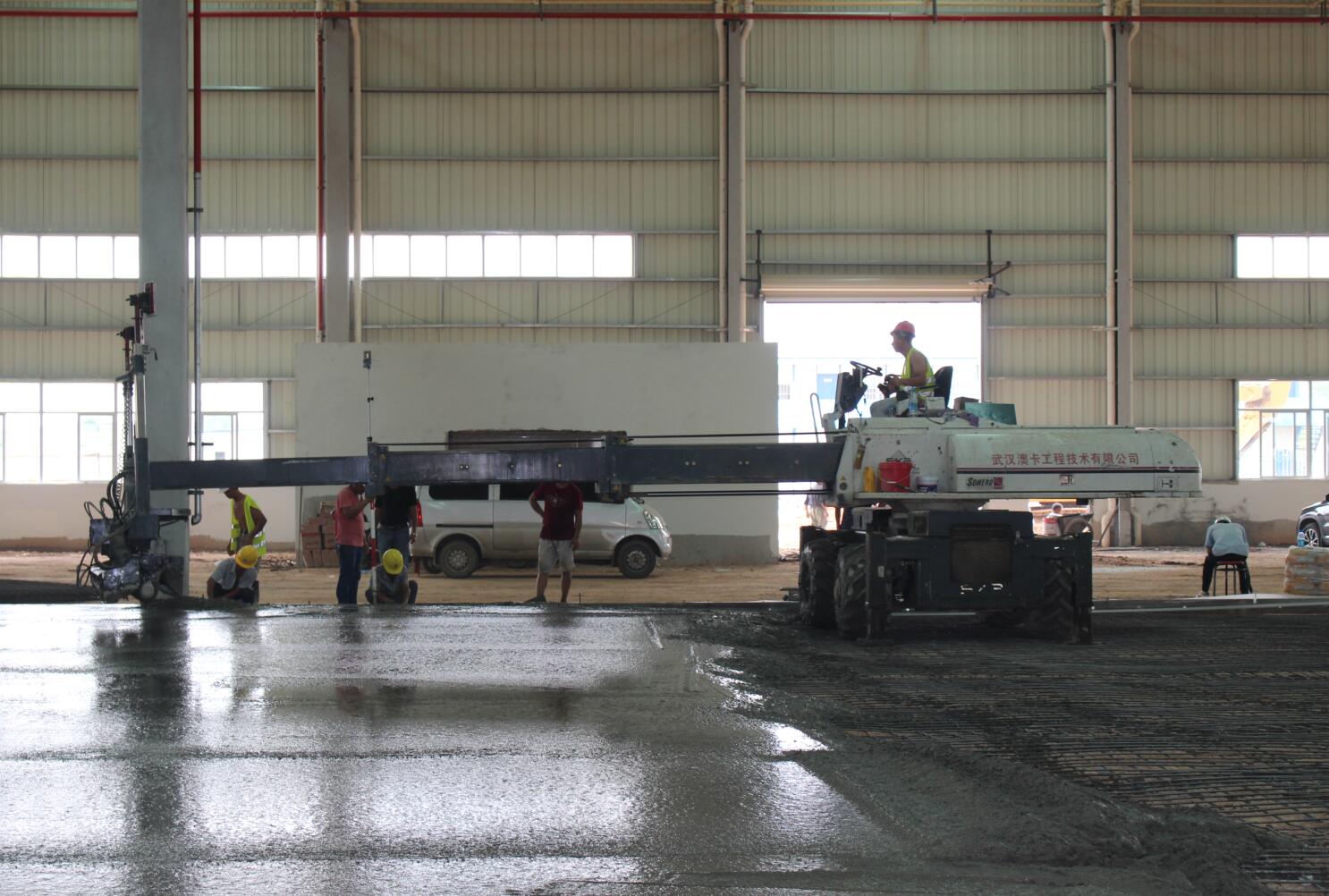 億和中建鋼構項目率先在地平混凝土現(xiàn)場引進激光振坪儀和磨光機,不僅在效率上大大縮短了施工時間,降低了人工成本,更是在效果上達到了比人工更為精準的技藝——混凝土的平整度、密實度、觀感度以及面層金剛砂顆粒分布度優(yōu)良,高低差控制在3~4mm。