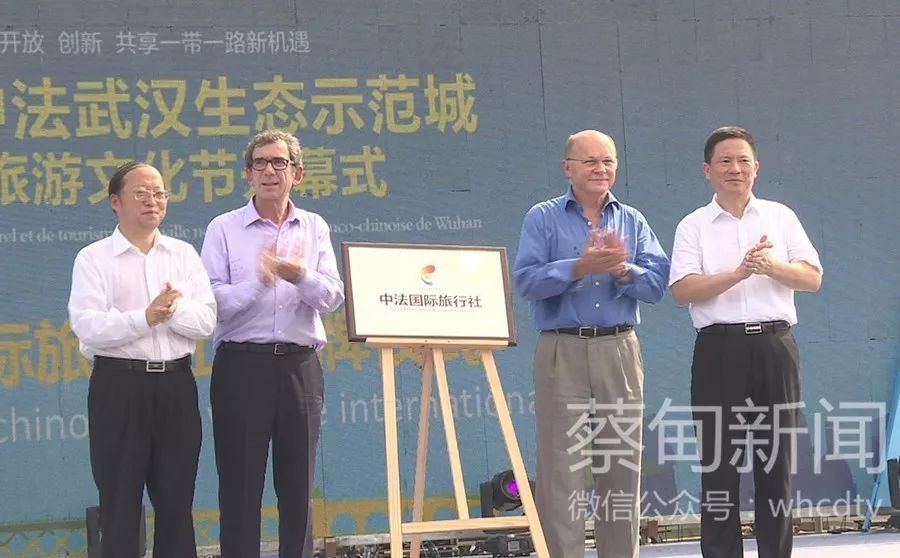 法國(guó)駐華大使黎想、法國(guó)生態(tài)與團(tuán)結(jié)化轉(zhuǎn)型部城市可持續(xù)發(fā)展協(xié)調(diào)人克里斯汀?樂(lè)維、副市長(zhǎng)龍良文、蔡甸區(qū)委書(shū)記、中法武漢生態(tài)示范城管委會(huì)主任劉子清共同為“中法國(guó)際旅行社”揭牌。