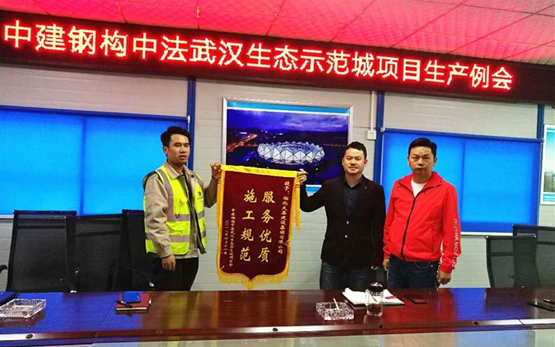 2018年4月13日,由集團公司參與承建的中法新城規(guī)劃館項目獲得中建鋼構嘉獎,授予“施工規(guī)范,服務優(yōu)質”的錦旗,項目經理徐斌和工程部副部長陳超共同接受了這一榮譽。