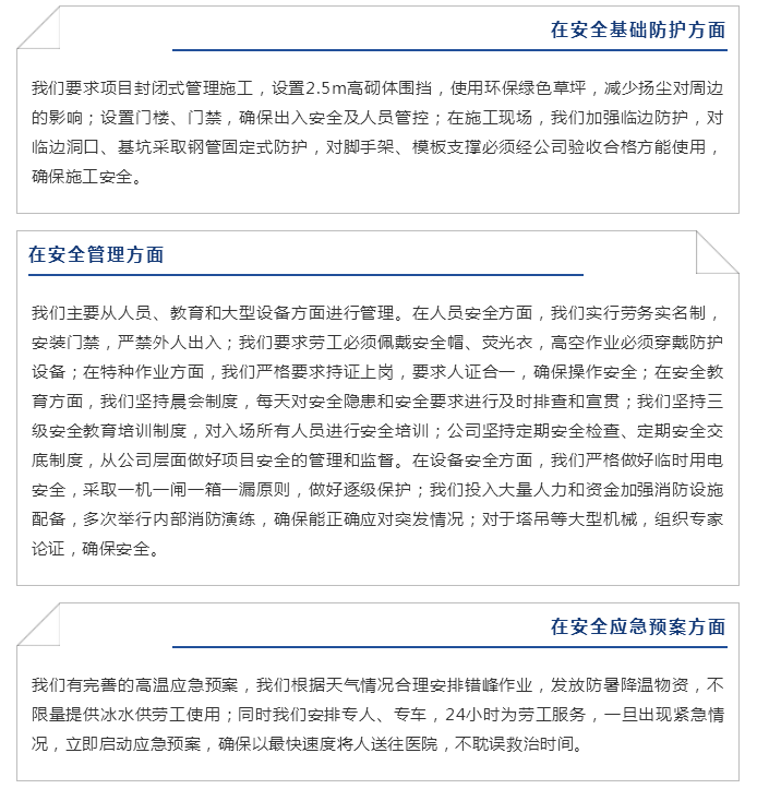抓工程技術(shù),必須一絲不茍;抓工程進(jìn)度,必須一天不讓;抓工程質(zhì)量,必須一點(diǎn)情面不講;抓工程安全,必須一刻也不放松。這四個必須是集團(tuán)公司精益求精、鑄造精品的法寶。未來,集團(tuán)公司將繼續(xù)將安全作為警鐘紅線,將品質(zhì)作為立業(yè)之本,全力做好每一個工程項目!