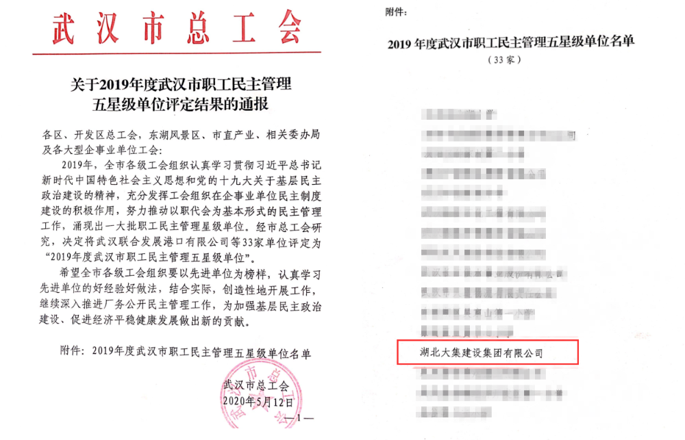 近日,武漢市總工會下發(fā)文件,湖北大集建設(shè)集團通過復(fù)審評定,榮獲“2019年度武漢市職工民主管理五星級單位”榮譽稱號,武漢市僅33家單位獲此殊榮。該項榮譽是武漢市企務(wù)公開民主管理工作最高級別的獎項,也是湖北大集建設(shè)在公司推行民主管理領(lǐng)域獲得的又一殊榮。