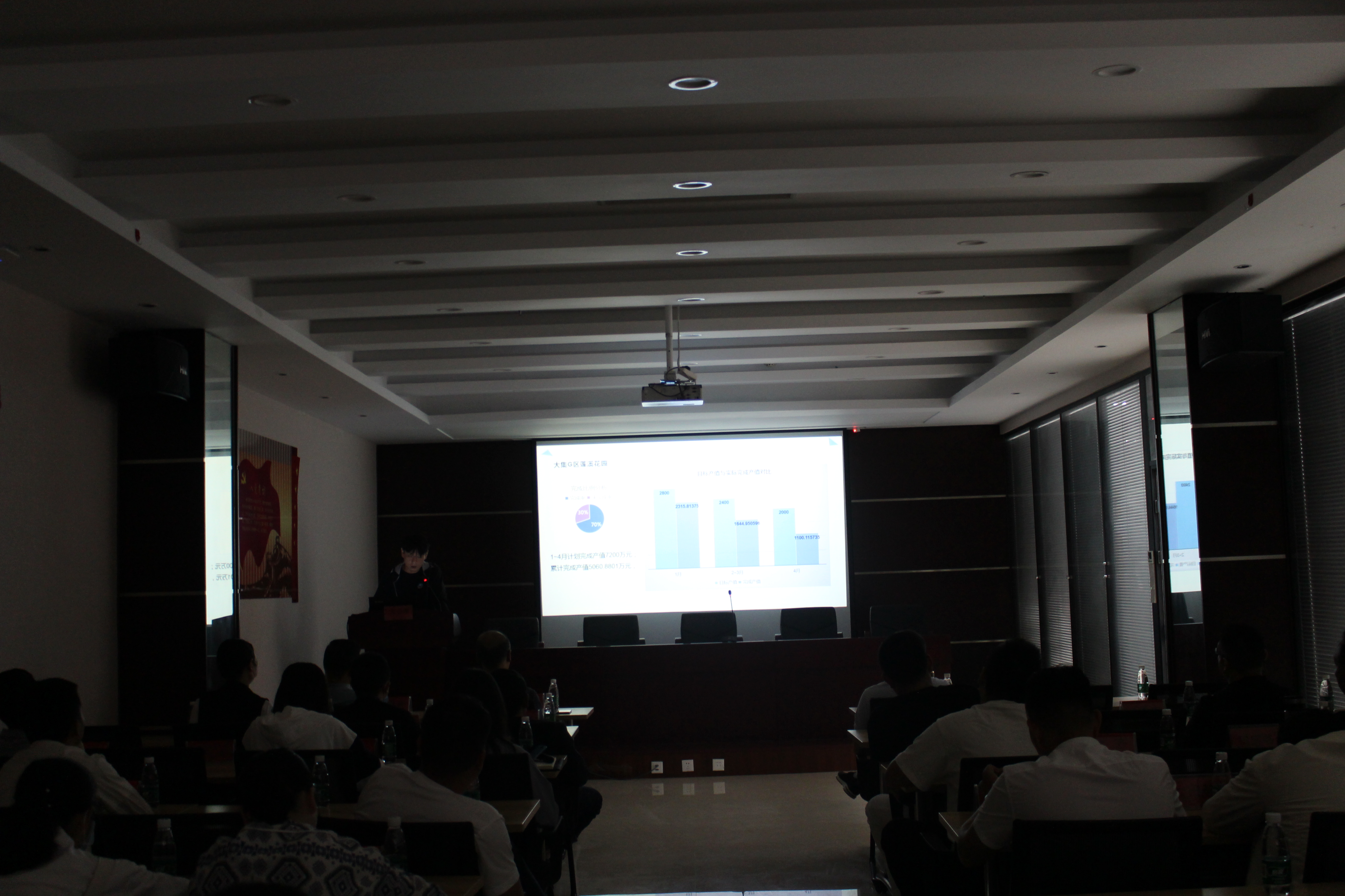 工程部質(zhì)檢員鄧文俊以數(shù)據(jù)說話,通過清晰明了的柱狀圖、餅狀圖對比,向大家匯報(bào)了截至4月底,集團(tuán)公司總產(chǎn)值完成情況以及各項(xiàng)目產(chǎn)值完成情況及進(jìn)度,并逐一分析了各項(xiàng)目產(chǎn)值未完成的原因。