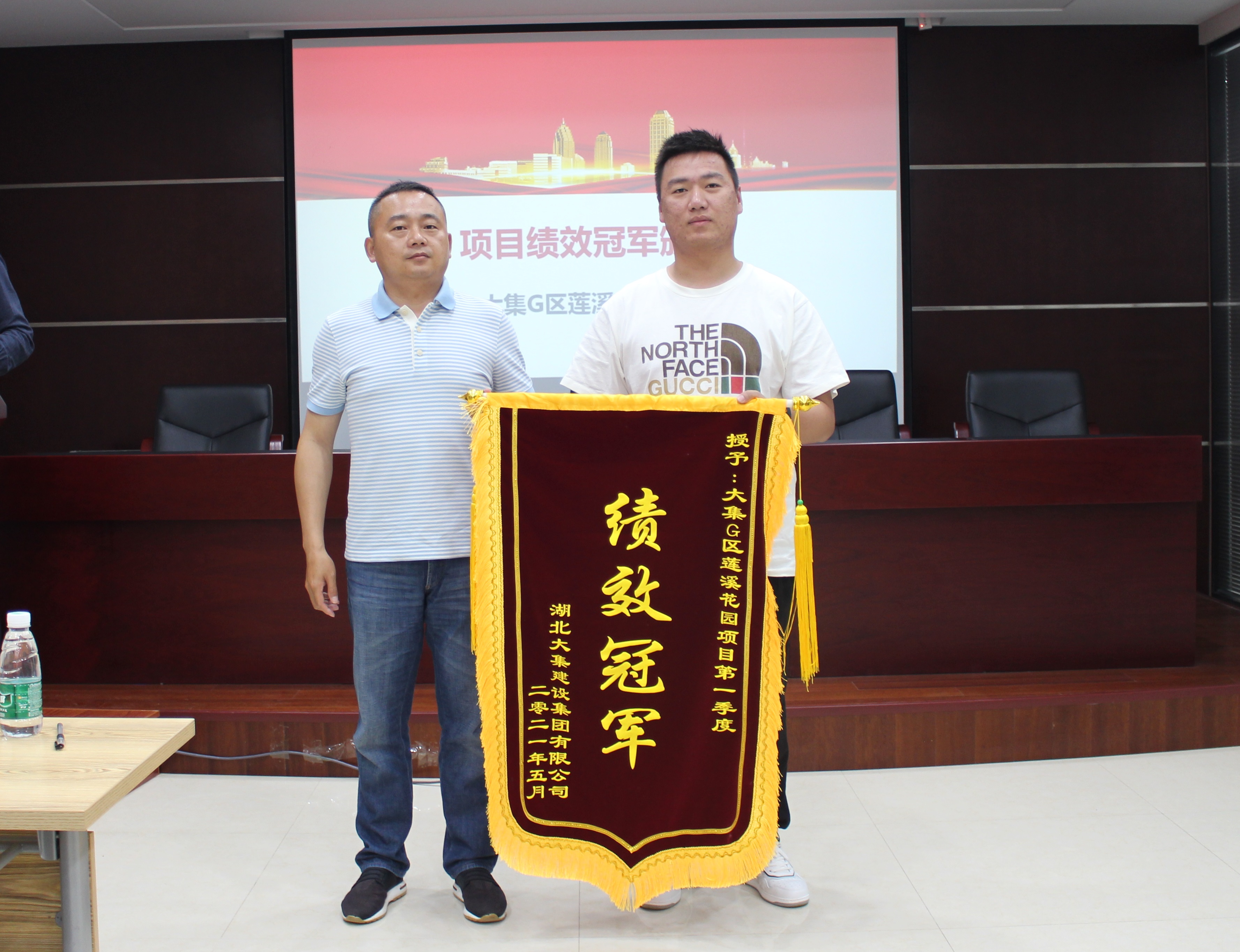 隨后,行政部部長李漢毛公布項(xiàng)目第一季度績效考核排名,并由集團(tuán)公司董事長徐濤為第一季度項(xiàng)目績效冠軍——大集G區(qū)蓮溪花園項(xiàng)目頒發(fā)錦旗及獎金。