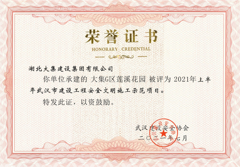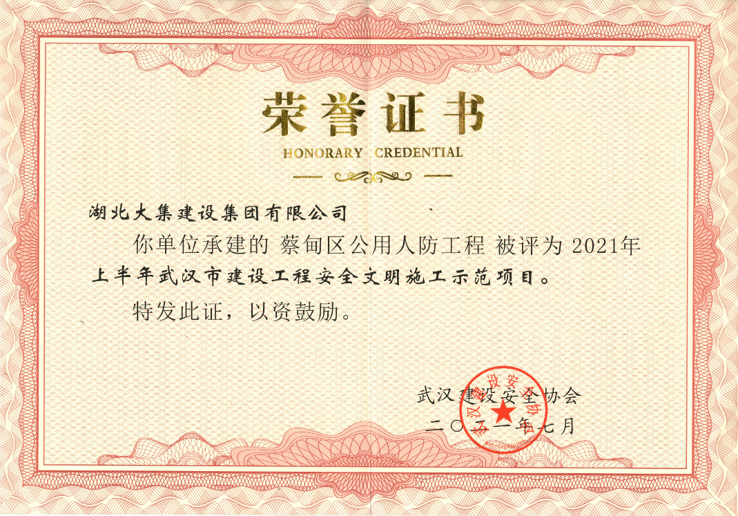 近日,由集團(tuán)公司承建的“大集G區(qū)蓮溪花園項目”和“蔡甸區(qū)公用人防項目”榮獲“2021年上半年武漢市建設(shè)工程安全文明施工示范項目”稱號。此項榮譽(yù)的獲得是對項目安全生產(chǎn)和文明施工管理的充分肯定,也為公司進(jìn)一步推進(jìn)安全標(biāo)準(zhǔn)化奠定了堅實基礎(chǔ)。