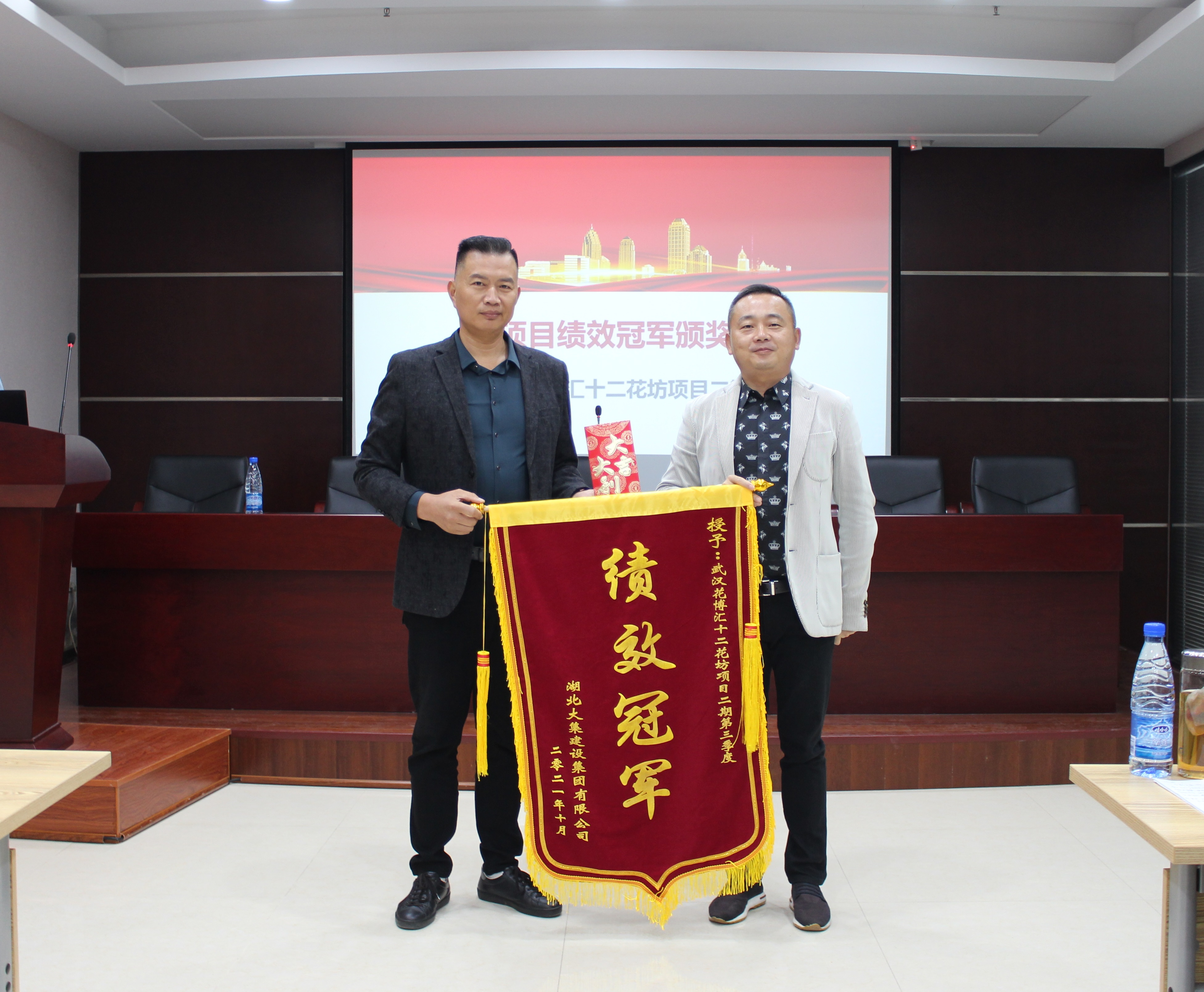 會(huì)議開(kāi)始,行政部公布集團(tuán)公司2021年第三季度項(xiàng)目績(jī)效考核結(jié)果,并由集團(tuán)董事長(zhǎng)徐濤為此次績(jī)效考核中的冠軍項(xiàng)目——花博匯十二花坊項(xiàng)目二期頒發(fā)錦旗和獎(jiǎng)金。