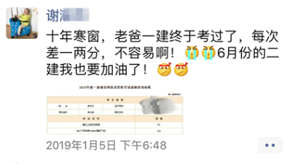 成功會遲到卻不曾缺席,2017年,謝守衛(wèi)通過經(jīng)濟與法規(guī)科目,2018年,通過管理與實務科目。十年磨“一建”,謝守衛(wèi)用他的堅持與努力向我們詮釋了一句話:想要學有所成,有所收獲,就必須要努力地去堅持!