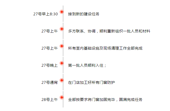 面對難題,他再一次積極與業(yè)主單位溝通協(xié)調,一方面安排人員先完成室內基礎設施的改造工作,以確保當天晚上首批人員順利入住;一方面安排另一個班組馬不停蹄地在門店連夜加工好所有門窗防護,確保第二天只用半天時間就完成所有安裝任務。他的科學決策得到了業(yè)主方的支持,也再一次用努力和用心向業(yè)主方交上一份滿意的答卷!
