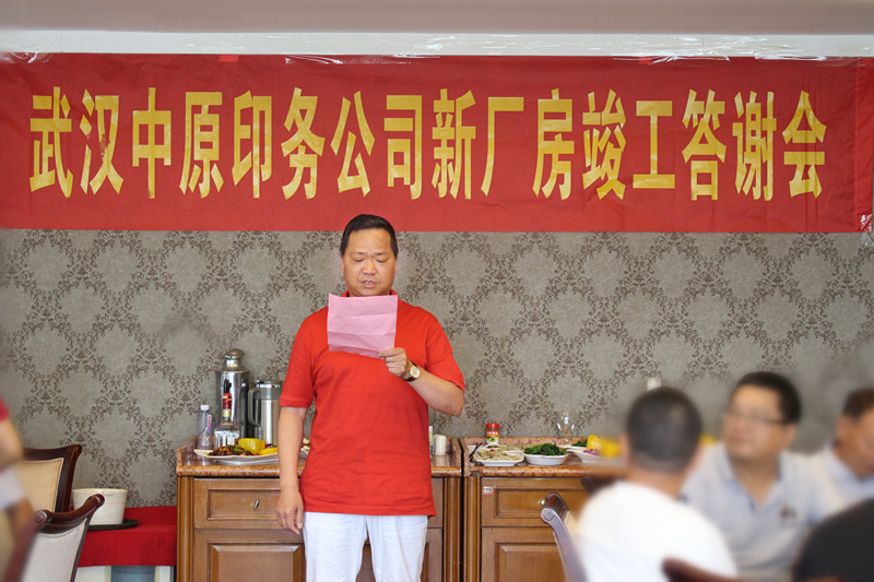 6月26日,武漢中原印務(wù)有限責(zé)任公司隆重舉行新廠房竣工答謝會(huì),集團(tuán)副總經(jīng)理徐家富、項(xiàng)目經(jīng)理田建新、招投標(biāo)部部長(zhǎng)胡鵬、財(cái)務(wù)部部長(zhǎng)鄧雪芬等受邀出席。