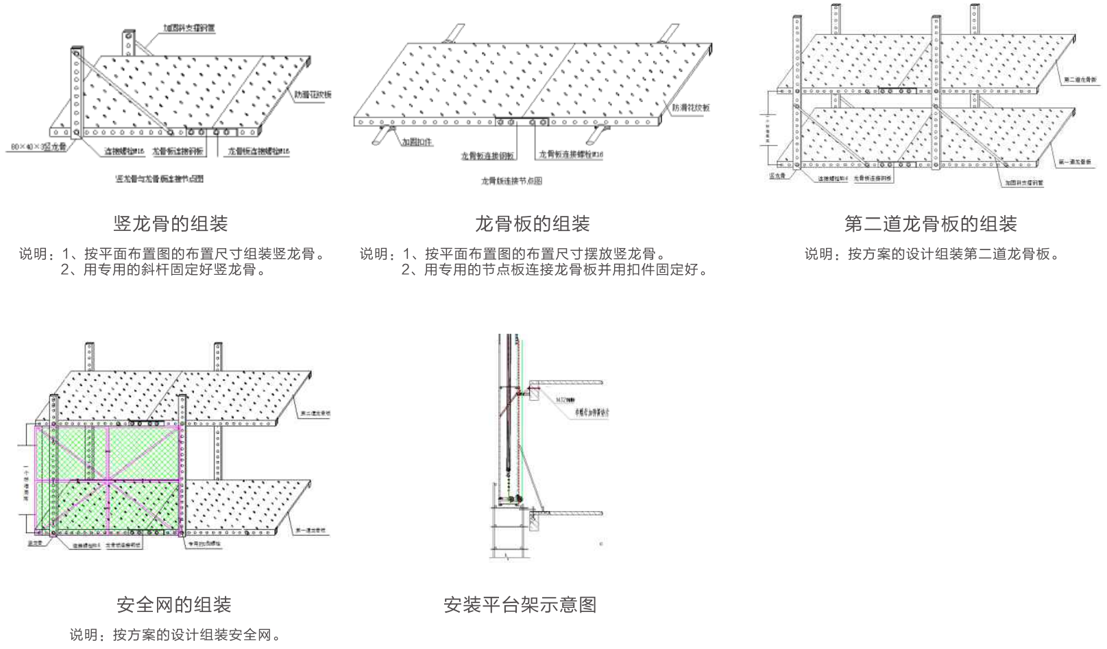 搭設(shè)平臺(tái)架并做水平調(diào)整→鋪設(shè)龍骨板→安裝下節(jié)導(dǎo)軌、豎龍骨、輔助豎龍骨→加輔助支撐桿及斜拉桿→水平鋼性拉結(jié)→安裝第二道龍骨板→安裝第一道安全立網(wǎng)→安裝第一道附墻件并卸荷→安裝中節(jié)導(dǎo)軌、豎龍骨、輔助豎龍骨→連續(xù)組拼架體直到安裝完2層各組架為止→連續(xù)組拼架體直到安裝完3層各組架為止→連續(xù)組拼架體直到安裝完4層各組架為止→鋪設(shè)電源線→安裝提升設(shè)備(進(jìn)入運(yùn)行階段)