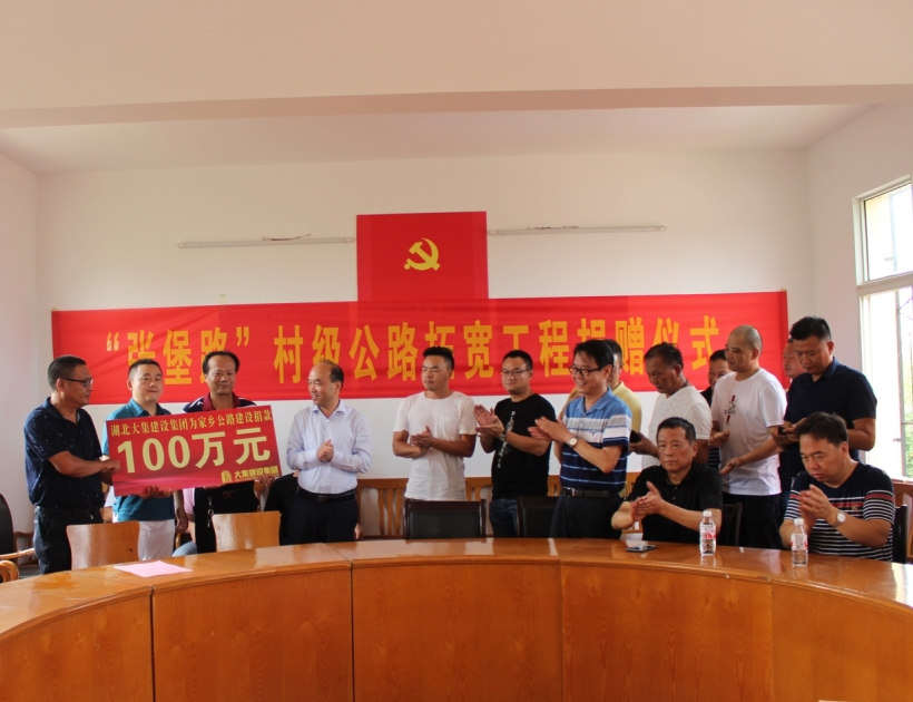 情系家鄉(xiāng)發(fā)展,勇?lián)鐣?zé)任。7月26日,集團(tuán)董事長徐濤、總經(jīng)理徐遠(yuǎn)征、副總經(jīng)理徐家富及各項(xiàng)目經(jīng)理來到蔡甸區(qū)大集街堡家咀村村委會,為“張堡路”村級公路拓寬工程進(jìn)行捐贈,集團(tuán)董事長徐濤代表湖北大集建設(shè)集團(tuán)為該工程捐款一百萬元。